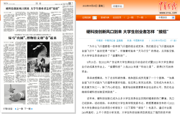 旋鹰未来科创团队被评选为北京地区高校大学生优秀创业团队(一等),入选年度科创之星,作为硬科技创业典型被中国青年报等媒体报道。公司将以成为未来自旋飞行开拓者为愿景,致力于从核心技术层面突破无人机的性能瓶颈和成本下限,开辟更多可能。