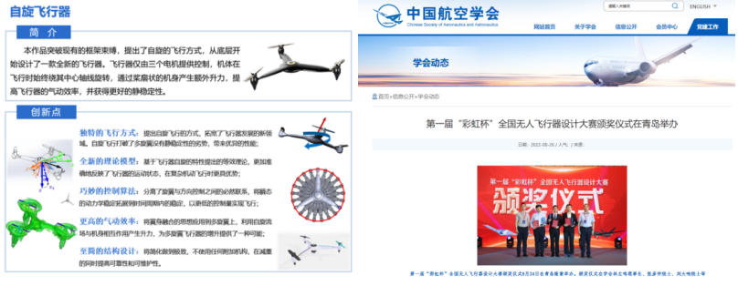 李泽波同学提出自旋飞行原理、等效控制模型、复合旋转空气动力学等新技术,开辟了自旋飞行的研究领域,设计出全球首款自旋多旋翼无人机,实现在静稳定性、气动效率方面的性能飞跃。以相关技术为基础,又先后研制了自适应倾转三旋翼、自适应尾座式三旋翼、复合桨盘直升机等多款新概念飞行器,将简化做到极致。基于这些成果,以第一作者身份参与多项科技竞赛并获奖。