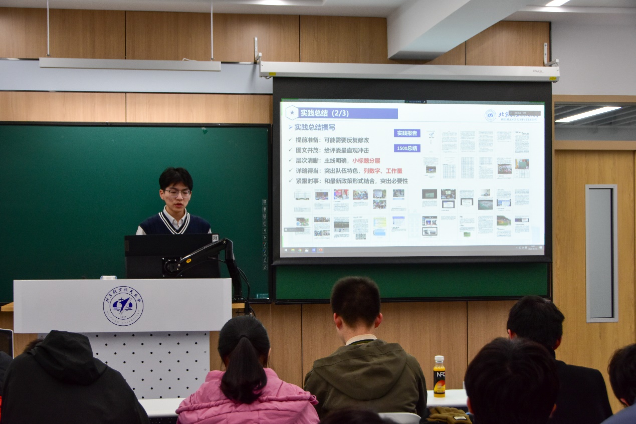 星源流明实践队队长刘恩启讲到,作为调研类实践队,学习理论必须贯穿始终,要学习最新的文件理论,每日及时反思总结,记录精彩镜头。要展现实践队专业特色,为实践主题贴上专属的“标签”。他总结凝练了国情调研类社会实践模式(育人7E模式),就组织架构——文献跟踪——发展规划——实践选地——实地调研——志愿服务——反思回馈等维度进行分享。