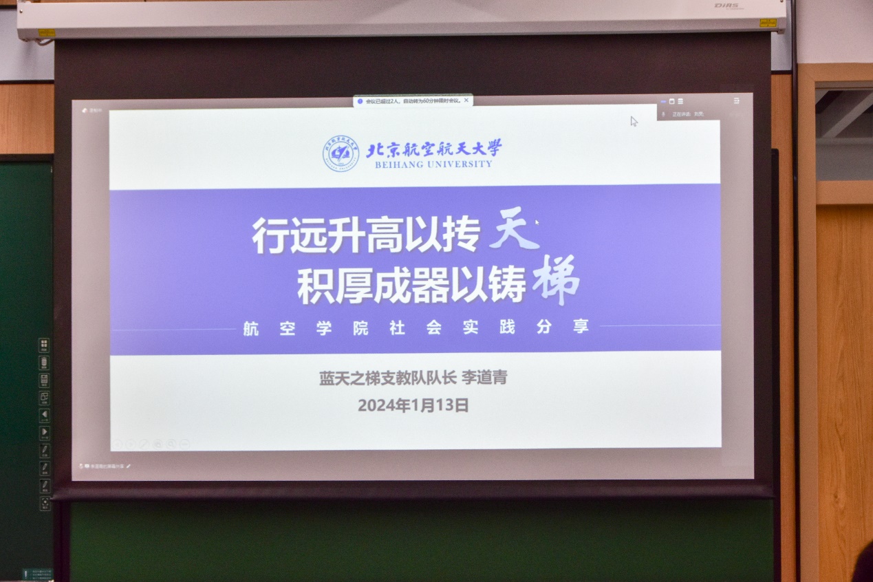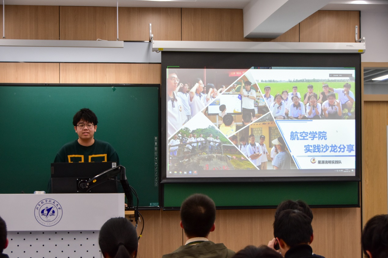 蓝天之梯实践队队长李道青从组织者怎样开展社会实践、参与者如何做好社会实践、社会实践能够带来什么,三个方面进行分享交流,鼓励更多在校学生参与到社会实践中来。