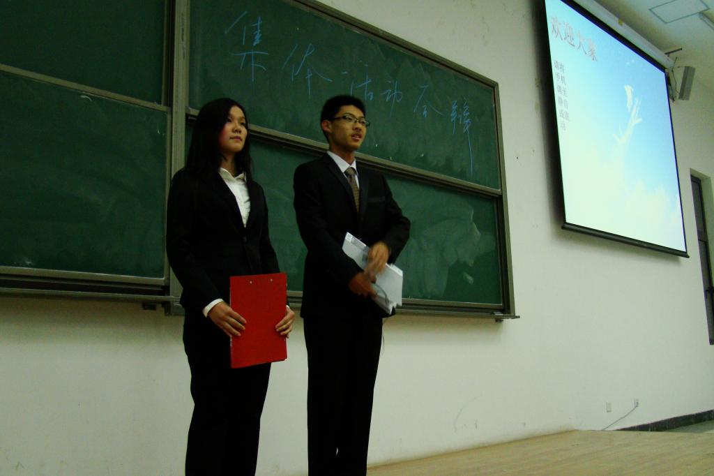 主持人宣布评选开始 评委组 正在展示的15班 12班在演讲 1105大班新生班集体答辩赛顺利结束 2011年11月4日晚7点,博彩导航 于J0-001举行了新生优秀班集体答辩活动预赛。