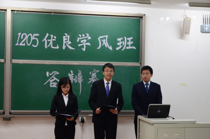 答辩现场 评委在提问 汪洲进行点评和经验交流 吴迪评委为获奖班级颁奖 参加答辩班级代表与评委们合影 2013年10月27日,博彩导航 1205大班优良学风班答辩在沙河校区三号教学楼2...