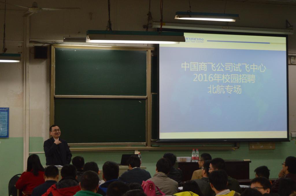 2015年10月26日下午两点,中国商飞公司试飞中心人事部门一行,来到博彩导航 ,在三号楼317教室进行了宣讲招聘活动。