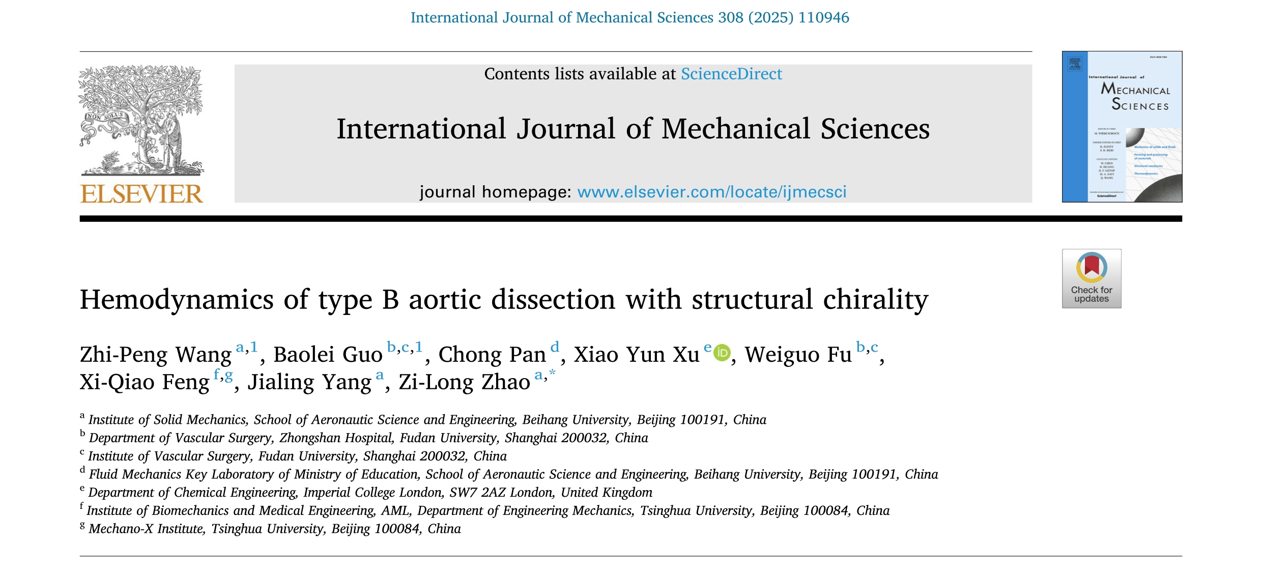 等高校学者,在力学顶级期刊《International Journal of Mechanical Sciences》(中科院1区,影响因子9.4)发表论文《Hemodynamics of type B aortic dissection with structural chirality》,揭示了胸主动脉夹层(TBAD)螺旋形貌演化对血液流动和血管重塑的影响规律,为疾病诊治提供了科学依据。手性是生物材料的内禀属性。手性形貌...